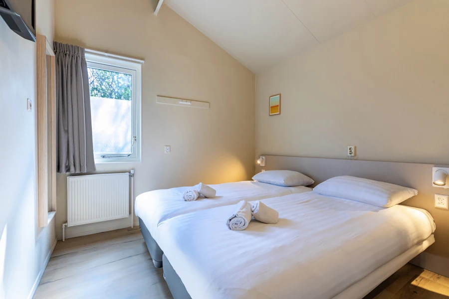 De bungalow beschikt over twee slaapkamers, elk voorzien van twee comfortabele boxspringbedden. Bijzonder handig voor gezinnen is dat er maar liefst twee badkamers aanwezig zijn, waarvan één met een inloopdouche. Ook aan praktisch gemak is gedacht: de cottage beschikt over een wasmachine en een wasdroger in een aparte berging. Met extra’s zoals gratis wifi, een standaard aanwezig kinderbedje en een kinderstoel, biedt deze Bornrif Cottage op Boomhiemke een zorgeloos en comfortabel verblijf voor jong en oud op Ameland.