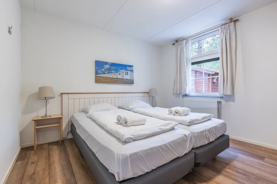 De bungalow beschikt over drie slaapkamers, waarvan één op de begane grond en twee op de eerste verdieping, allen voorzien van comfortabele boxspringbedden. Met een badkamer op de begane grond en een apart toilet is de woning praktisch ingedeeld voor gezinnen of groepen vrienden. Buiten vind je een ruim terras met tuinmeubilair, omgeven door groen. Dankzij de faciliteiten op het park, zoals het subtropisch zwemparadijs en de diverse speeltuinen, is er voor jong en oud altijd iets te beleven in en rondom deze fijne Texelse uitvalsbasis.